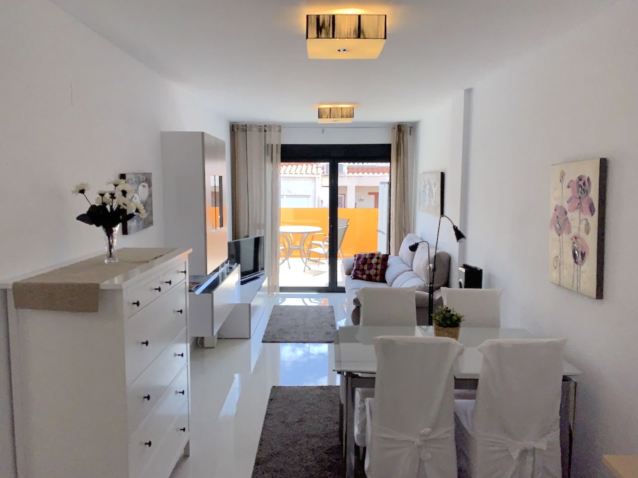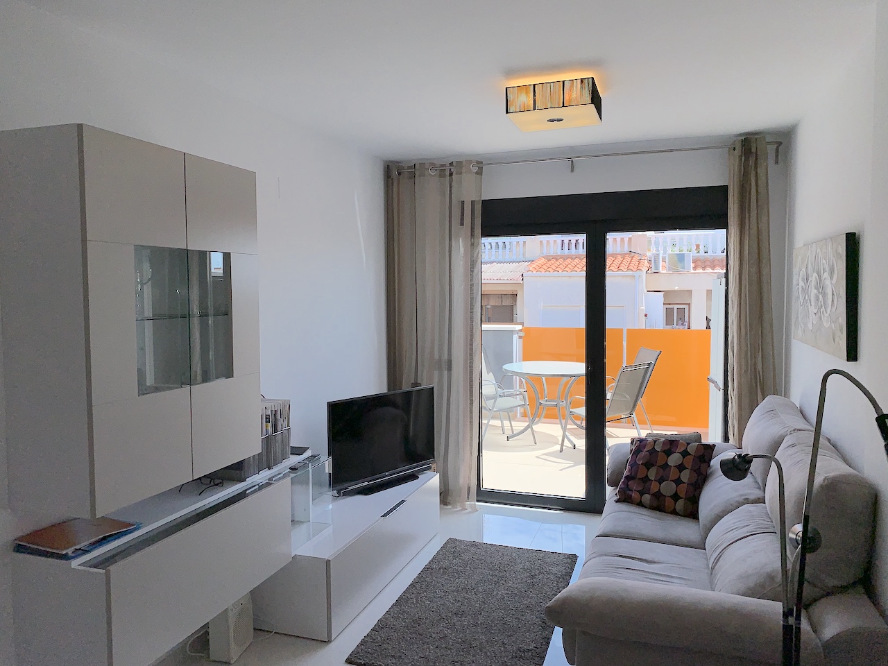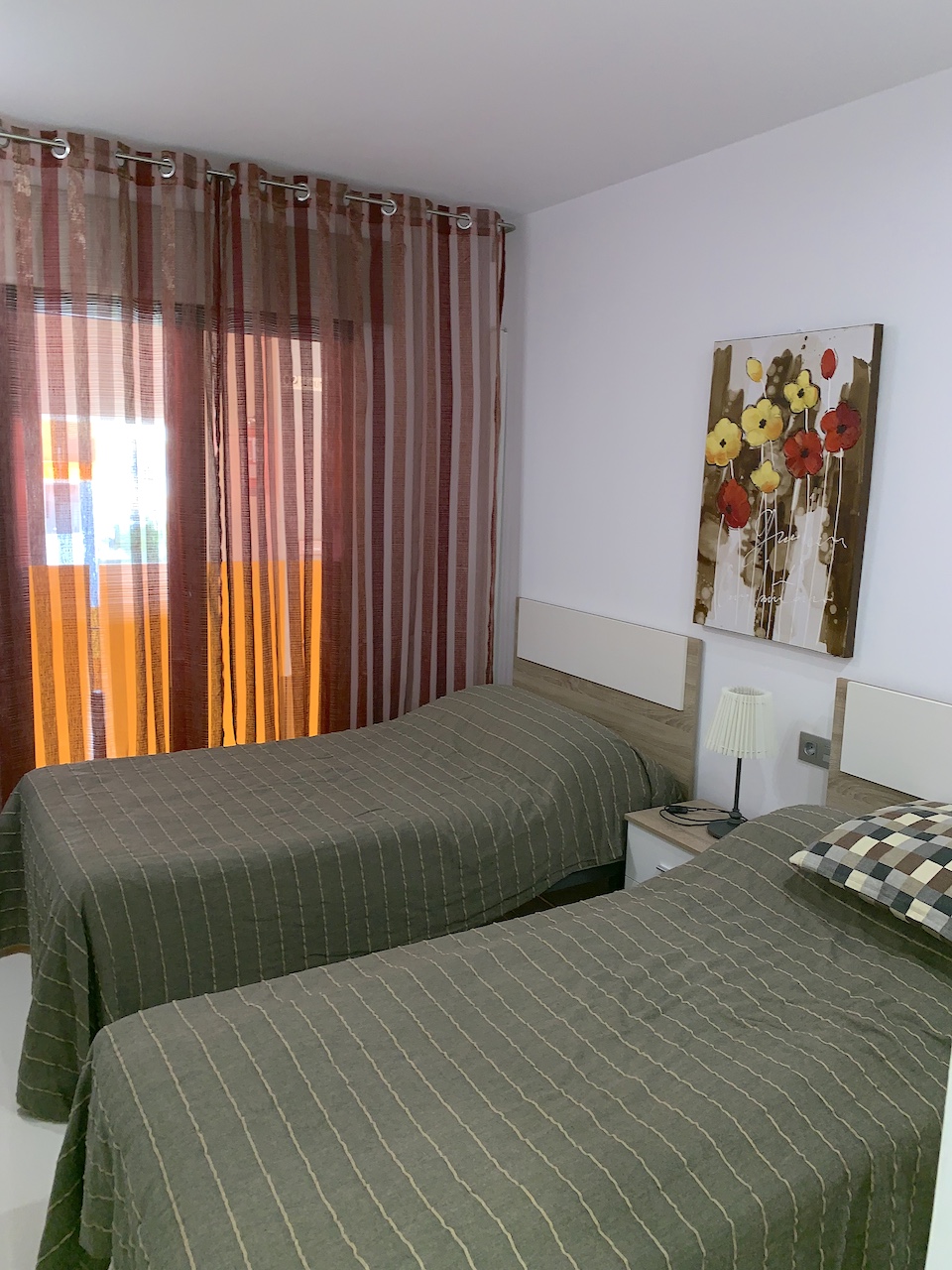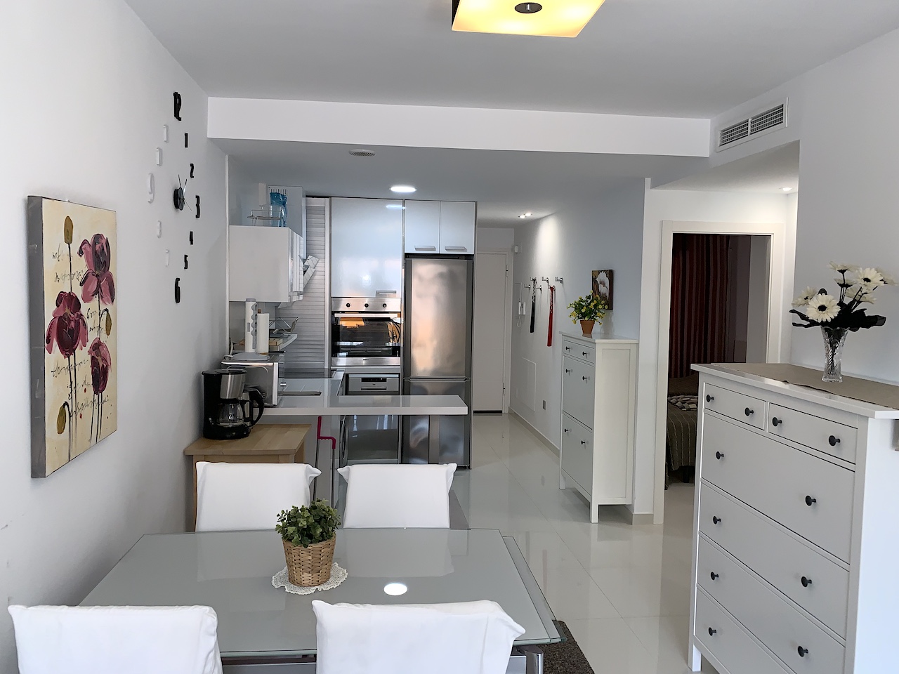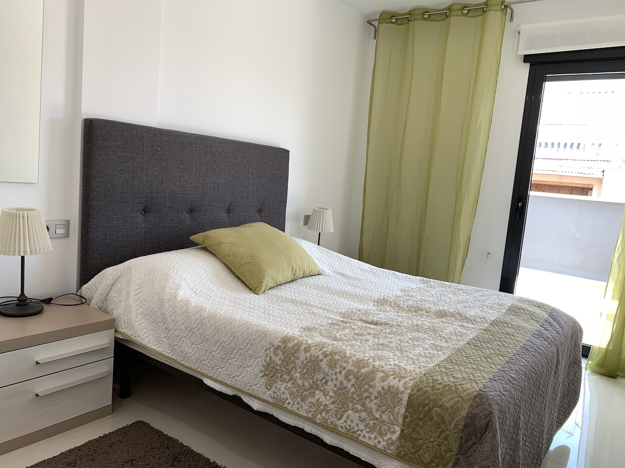 A wonderful two-bedroom new, stylishly furnished apartment (approx. 60m2) near Los Locos and El Cura beaches (approx. 700 meters to both beaches). The apartment, completed in 2015, has a living room/kitchen, two bedrooms, two bathrooms, an east-facing terrace and its own apartment-sized roof terrace. The apartment is the so-called apartment through the house, so it is easy to ventilate. Access to the balcony from both the living room and the second bedroom. Access to your own sunny roof terrace is via a spiral staircase from the balcony.