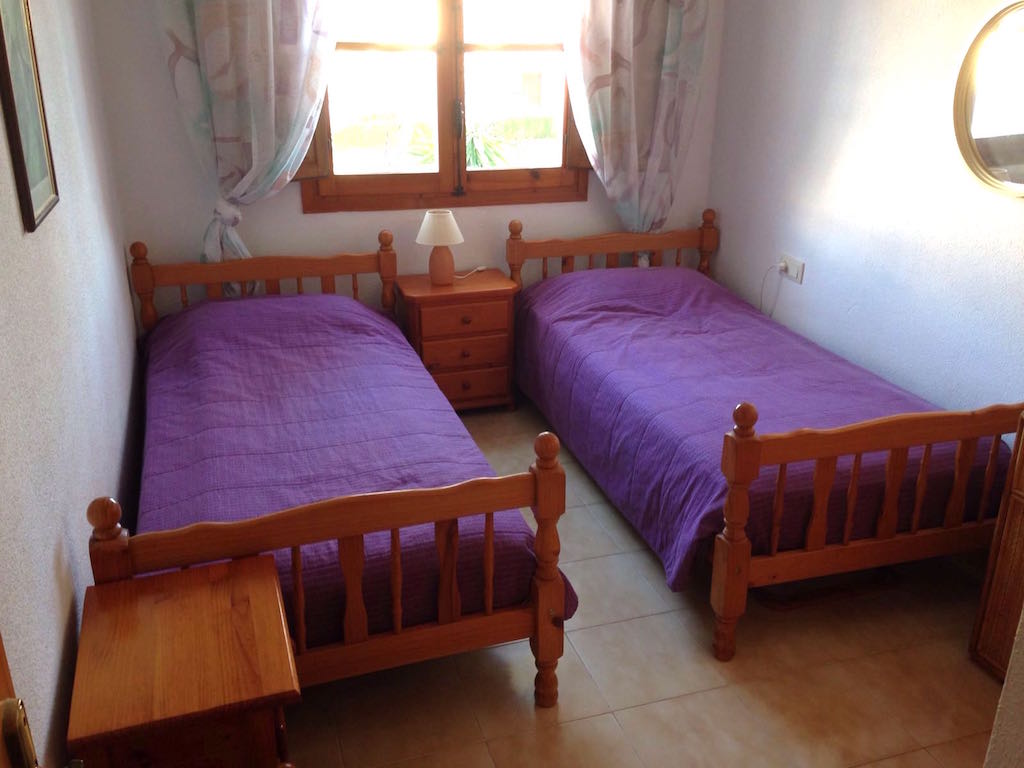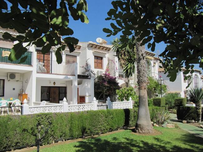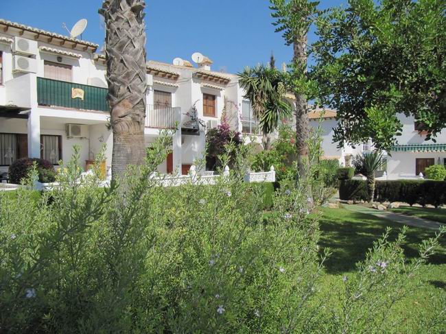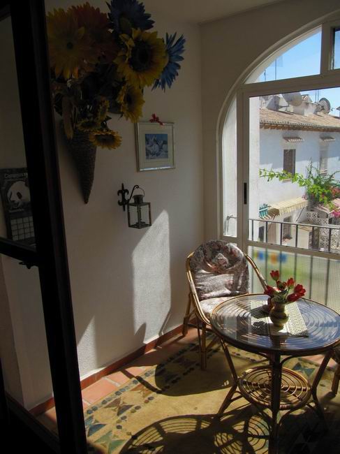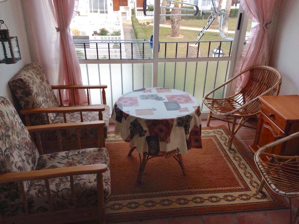 Apartment on the top floor of a two-story terraced house: living room with kitchen on one wall, one bedroom and bathroom = 37 m2. In front of the apartment, an east-facing outdoor terrace, which is completely glazed. View from the terrace to the park-like courtyard and the Laguna de Torrevieja salt lake.