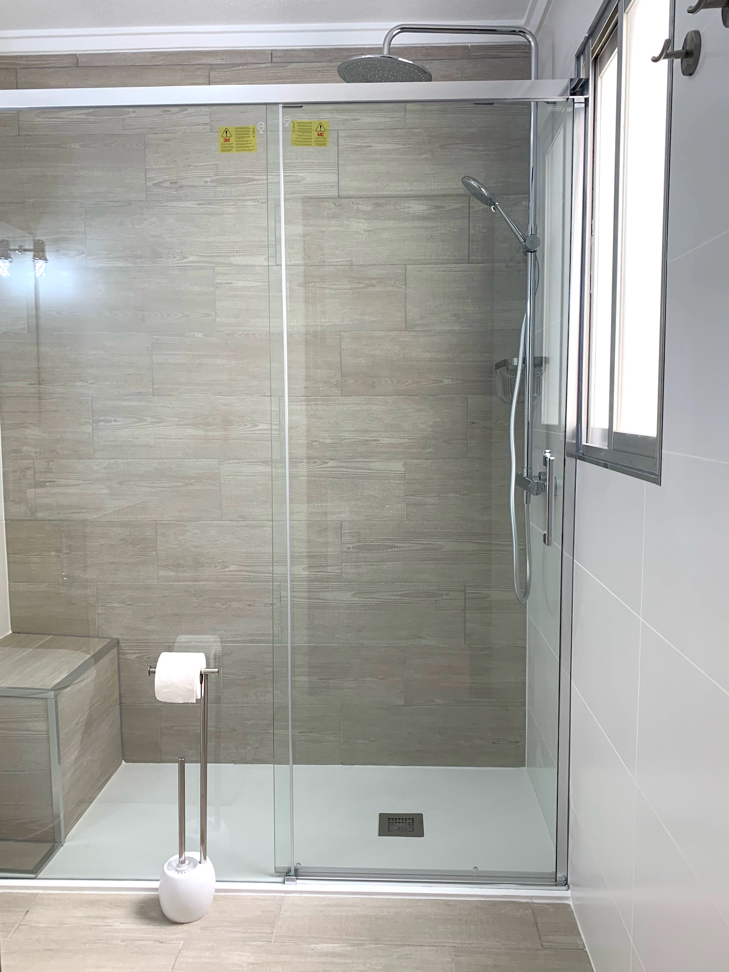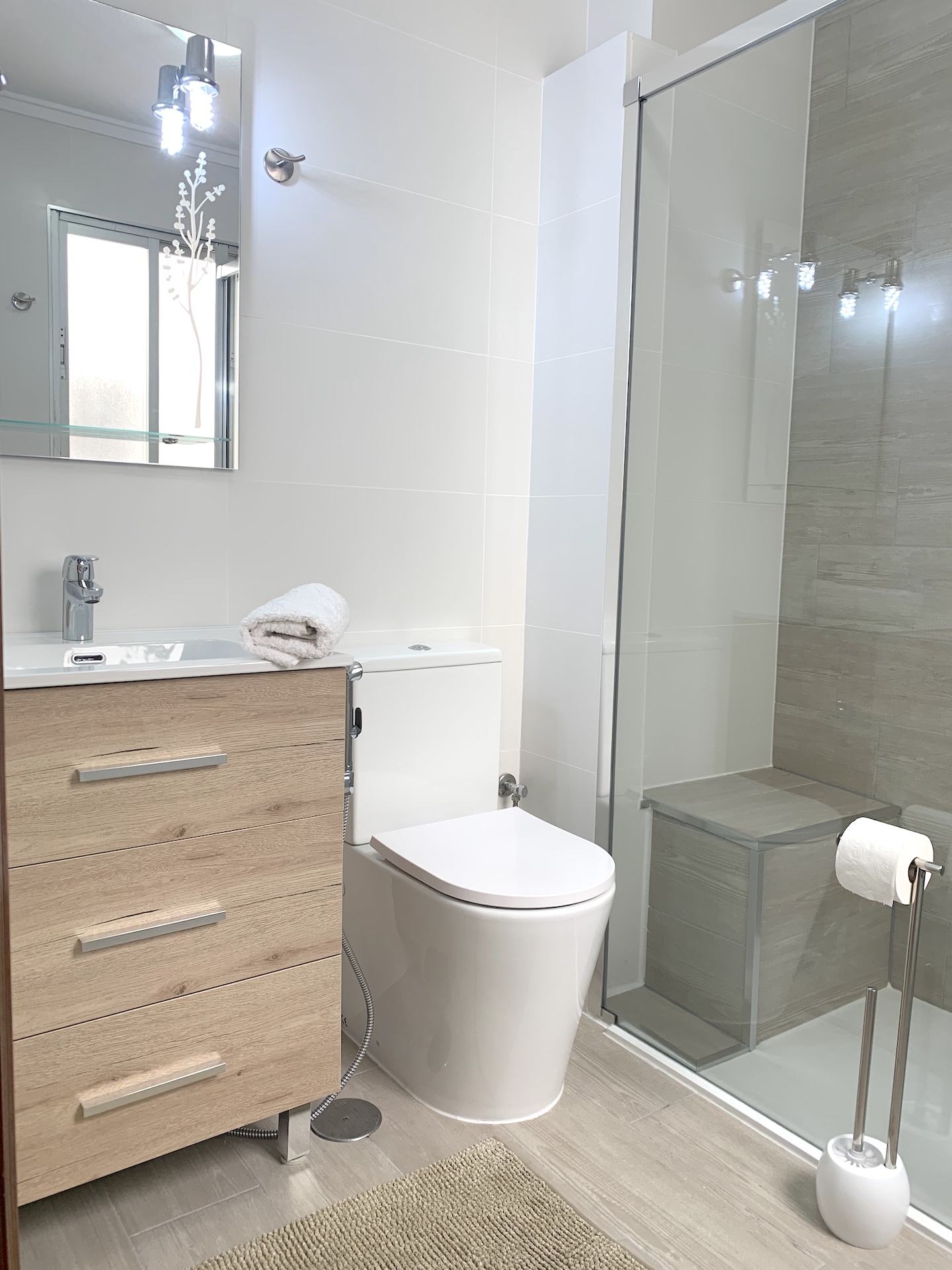 The bathroom has a shower