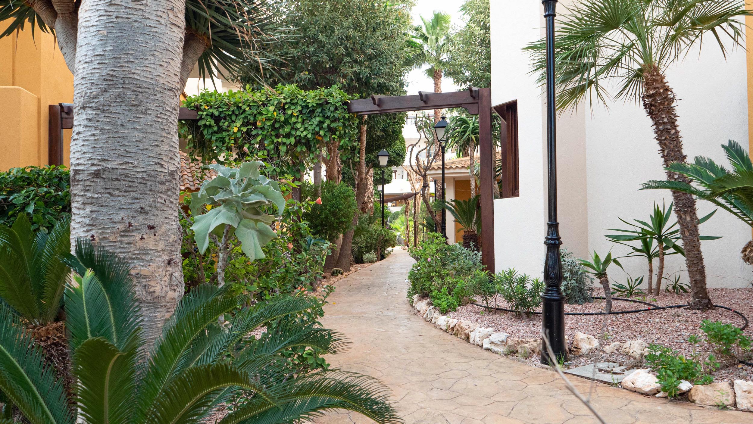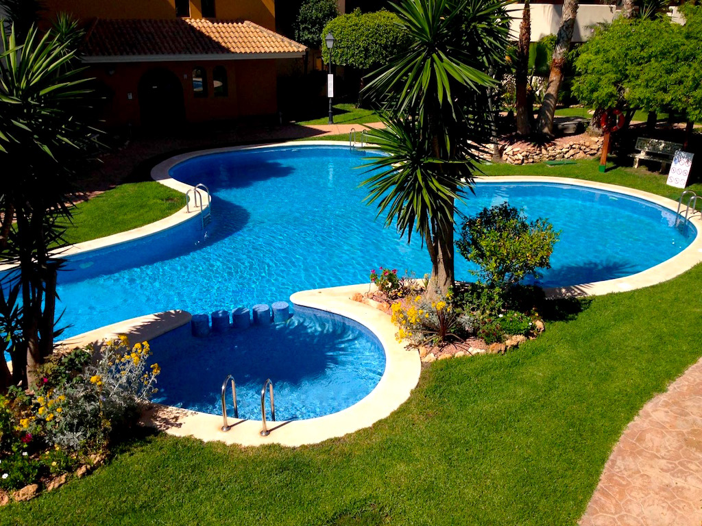 The apartment complex has a nice garden area and two swimming pools.