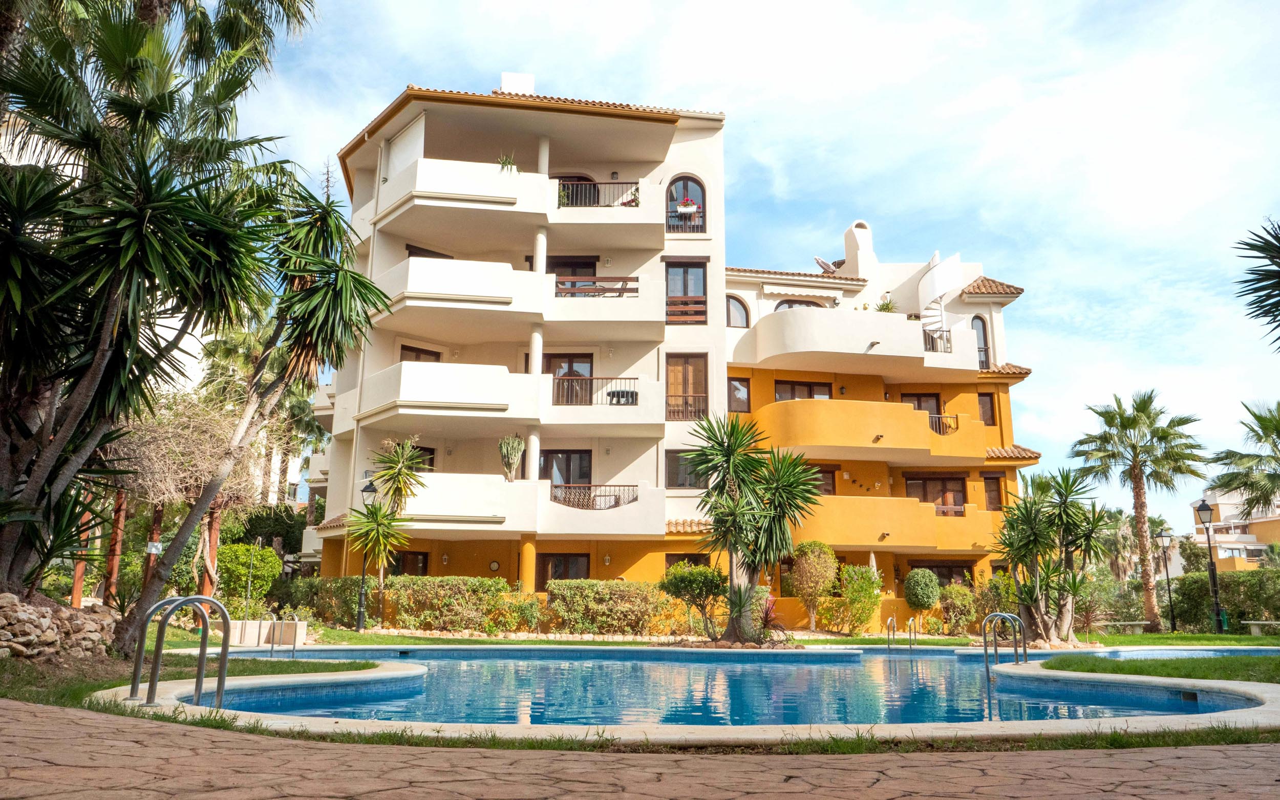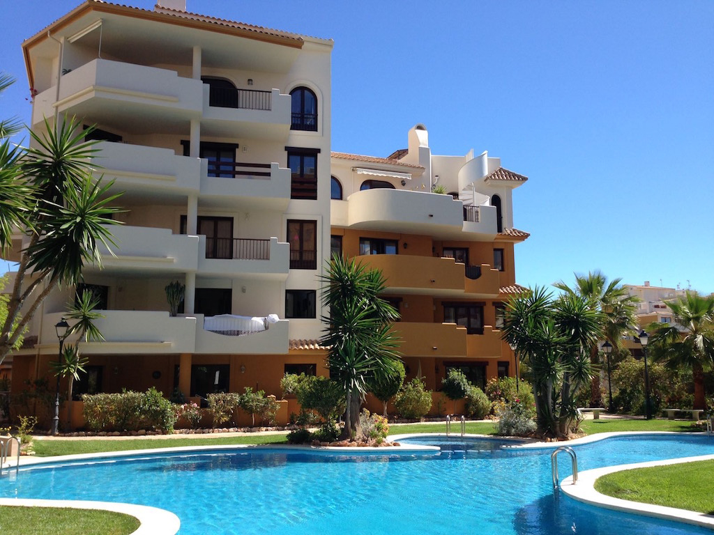 A spacious one-bedroom apartment on the second floor of a four-story apartment building (built in 2004) in Punta Prima, with a living room, kitchen, bathroom, one bedroom and a south-facing open balcony facing the swimming pool with views all the way to the sea.