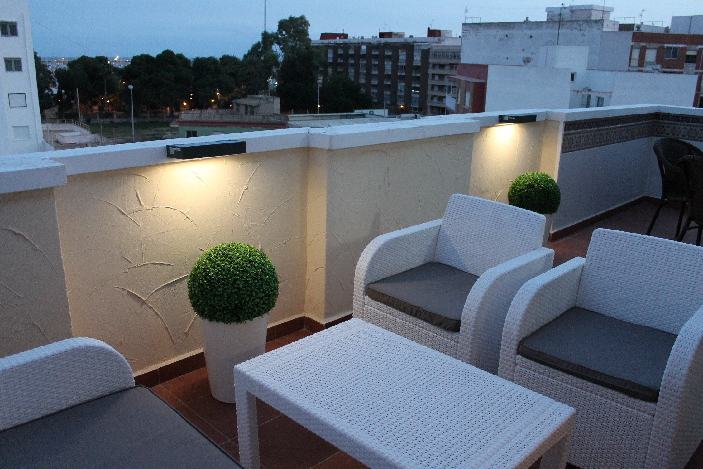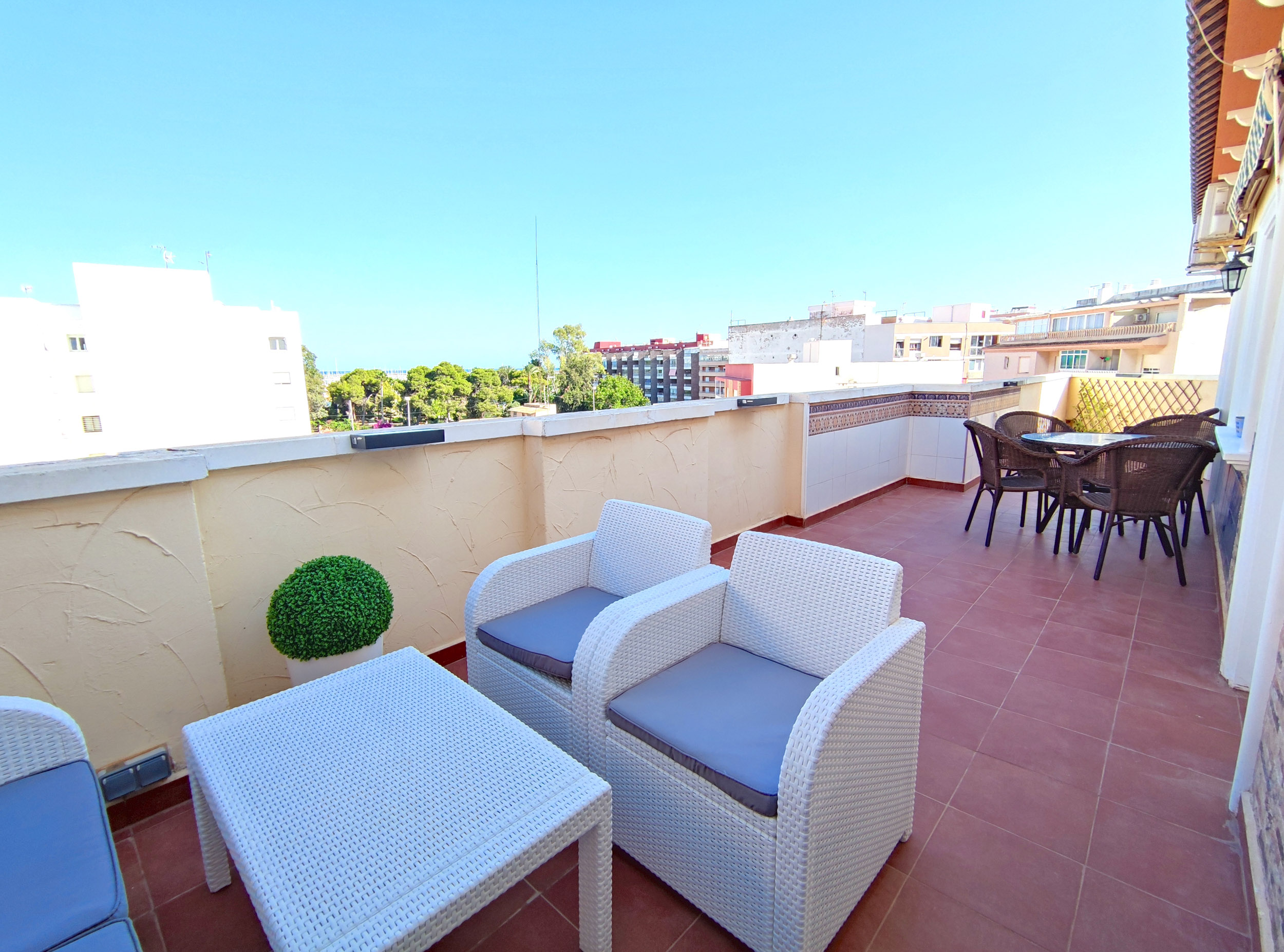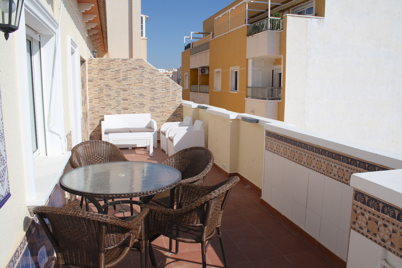 Atico-apartment on the top floor of a Spanish-style four-story apartment building, with two bedrooms, kitchen, living room, bathroom and a large balcony on the southeast side. An awning on the balcony.
