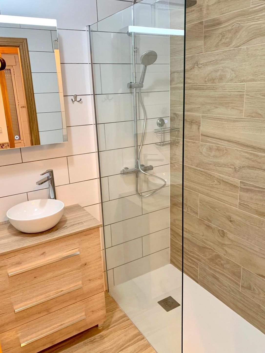The bathroom has a shower