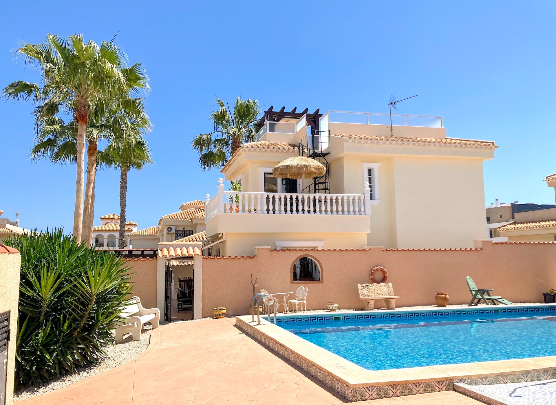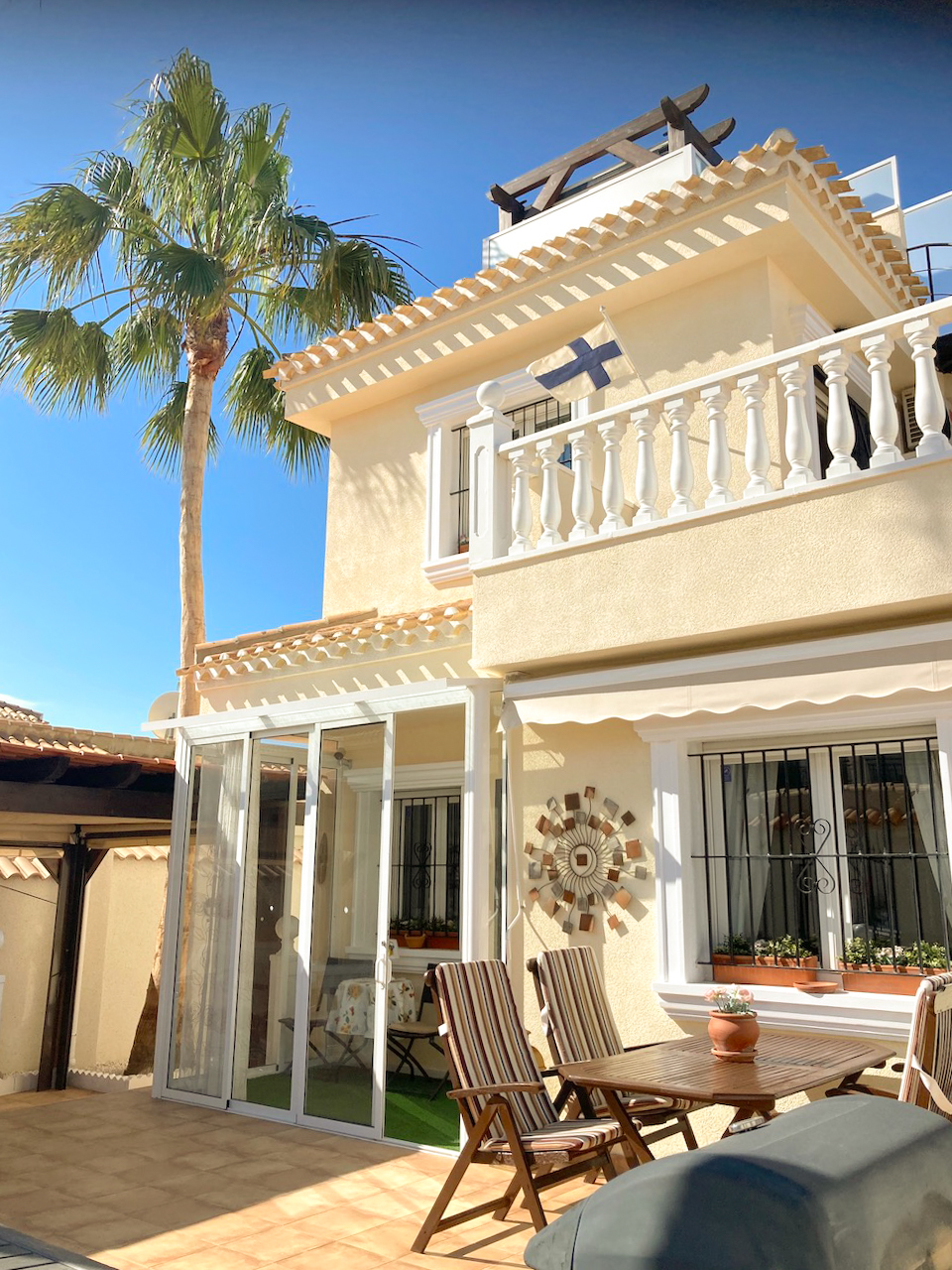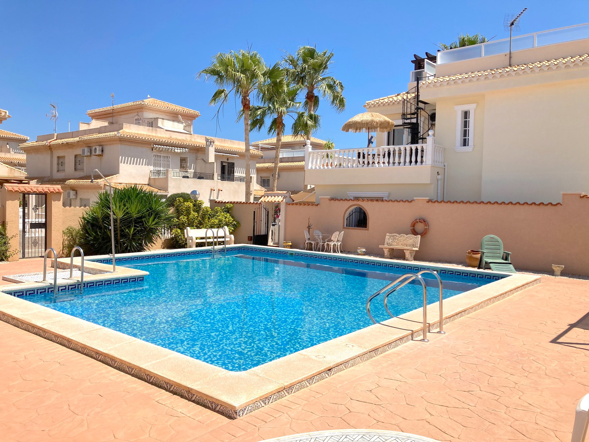 The condominium’s swimming pool is right next to the Villa and there is a separate access gate from the yard of the apartment. The beach is only 500 meters away, and the nearest shops and restaurants are 100 meters from the apartment. The Saturday market of Playa Flamenca is only 400 meters from the apartment and the popular shopping center Zenia Boulevard is 750 meters away.