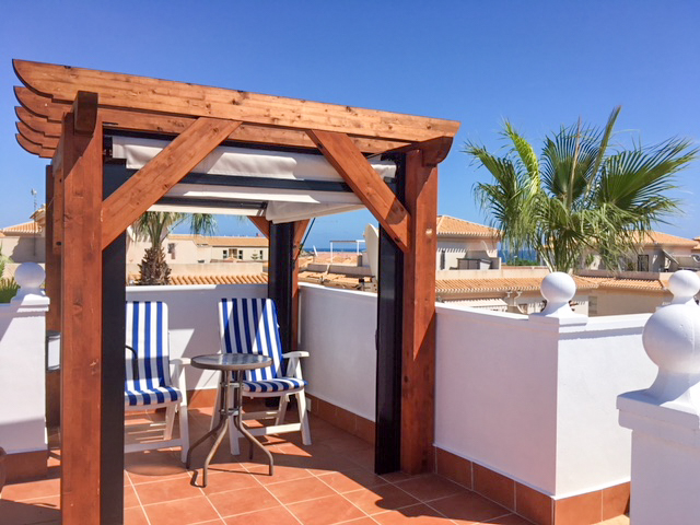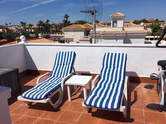 Three bedroom detached house in Orihuela Costa. On the first floor, one bedroom, living room, kitchen, dining room, bathroom, storage room and utility room. The second floor has a bathroom and two bedrooms, both of which have access to the balcony. From the balcony of the second bedroom there is also access to the roof terrace with sun loungers and a table. There are sea views from the roof terrace.